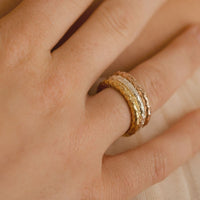 A mix of silver, yellow, and rose gold with mermaid scales and croissant curves. Shimmery, playful, and full of personality.