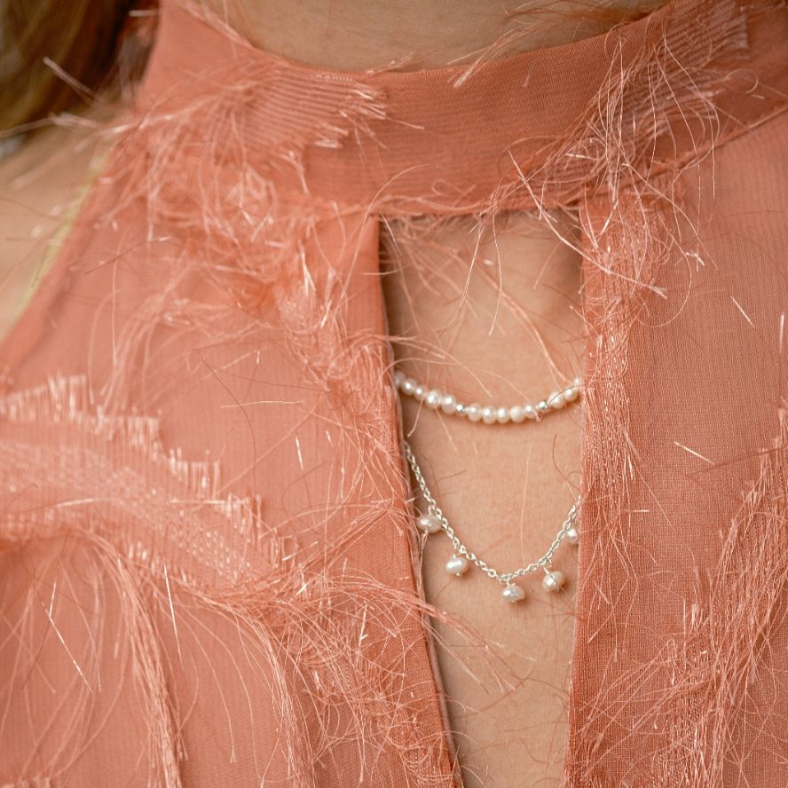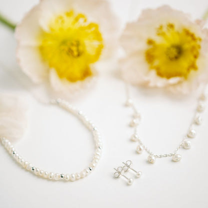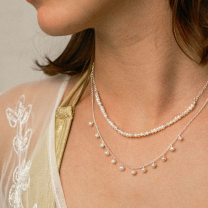 Add a touch of whimsy to your look with this combination of our sparkling silver and seed pearl necklace, and the charming dangle pearl necklace that dances with every move. Paired perfectly with a set of adorable mini pearl studs, this combo brings playful elegance to any outfit—because who says pearls have to be serious? Perfect for brightening up your day or adding just the right amount of fun to your evening attire.